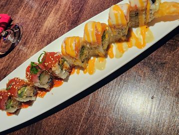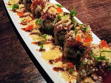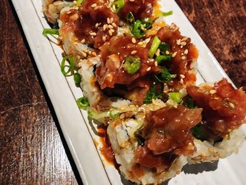 shrimp tempura, eel, cucumber, avocado, topped tuna tataki, masago, scallions, eel sauce, sesame seeds
